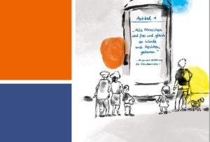Ausschnitt aus dem Coverbild, Figuren vor oranger und blauer Fläche